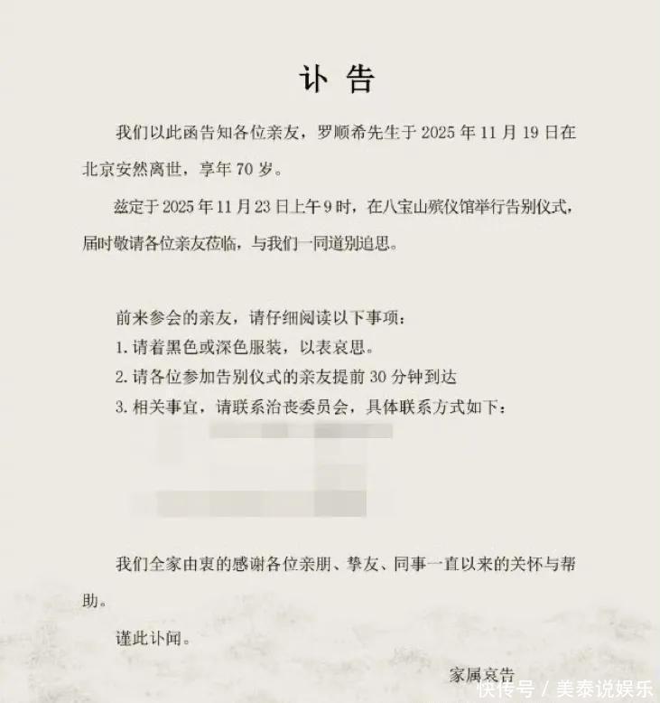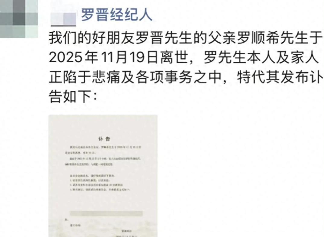 罗晋的经纪人在朋友圈发布讣告,罗晋父亲罗顺希先生11月19日在北京安然离世,享年70岁。罗晋及家人正处于悲痛中,全心处理各项后续事务。讣告内容简洁克制,没有过多透露细节,仅告知亲友和关注者这一消息。